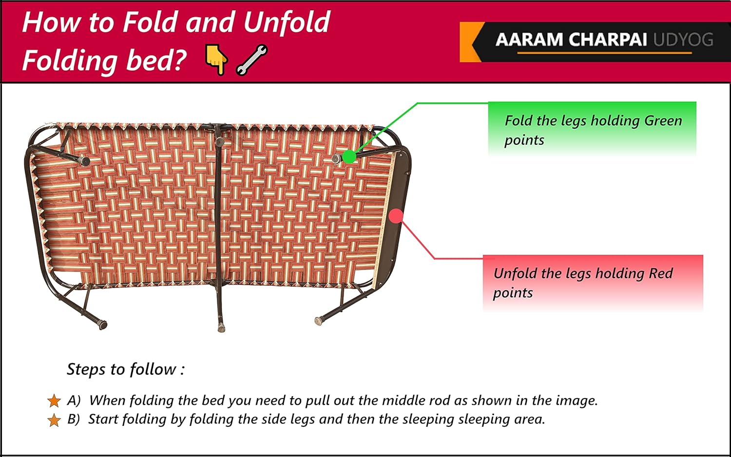 Manufactured by AARAM CHARPAI UDYOG, this niwar folding bed is quality-checked and designed to meet everyday Indian household requirements.