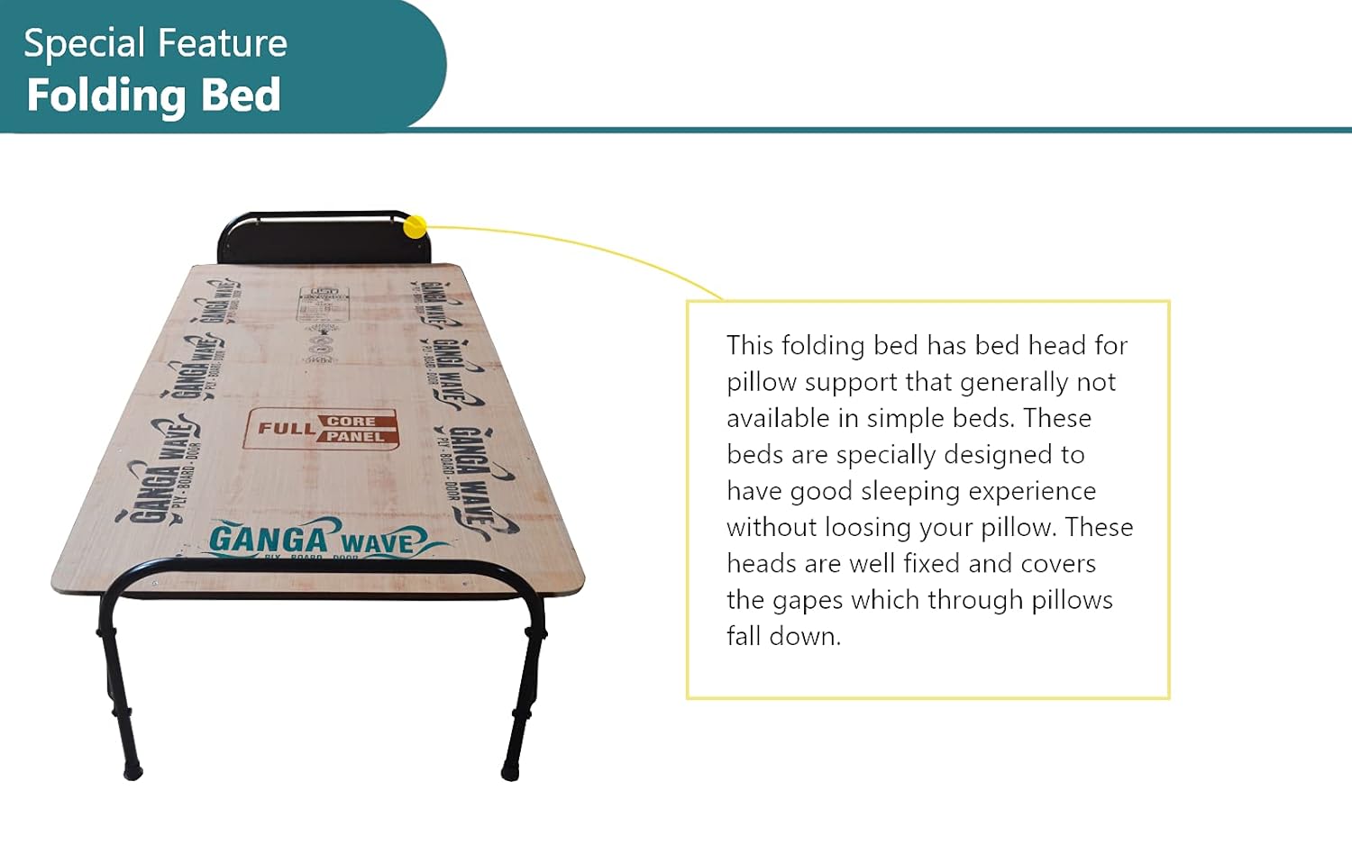 The AARAM CHARPAI UDYOG Plywood Folding Bed (3×6 ft) is designed for users who prefer a solid plywood sleeping base along with head support for pillows. It offers better sleeping posture and comfort compared to basic folding beds.
